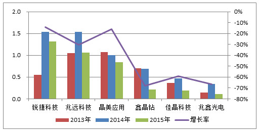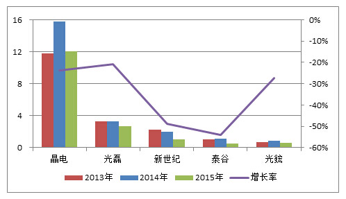 GGII: 三季度臺(tái)灣LED市場衰退明顯,市場回暖或?yàn)橥?/h1>來源:中圖科技 發(fā)布時(shí)間:2015-10-23 點(diǎn)擊:5377 次摘要:臺(tái)灣LED藍(lán)寶石、芯片及封裝市場三季度業(yè)績下滑幅度均超過23%,相比第一和第二季度,下滑明顯加快。2015年年中,市場曾預(yù)測臺(tái)灣LED市場下半年會(huì)逐漸回暖,訂單會(huì)明顯增加,從目前各企業(yè)交出的業(yè)績報(bào)告來看,市場并未出現(xiàn)預(yù)料中的回暖,反而呈現(xiàn)加速下滑的趨勢。 【高工LED專稿】 【文/GGII】高工產(chǎn)研LED研究所(GGII)統(tǒng)計(jì)數(shù)據(jù)顯示,2015年三季度,臺(tái)灣6家藍(lán)寶石基板上市企業(yè)總營收3.75億元(單位:人民幣,下同),同比減少32.7%,環(huán)比減少25.1%;5家芯片上市企業(yè)(璨圓自8月起不再公開發(fā)行)總營收16.86億元,同比減少27%,環(huán)比減少13.6;10家LED封裝上市企業(yè)總營收31.65億元,同比減少23%,環(huán)比減少8%。 臺(tái)灣LED藍(lán)寶石、芯片及封裝市場三季度業(yè)績下滑幅度均超過23%,相比第一和第二季度,下滑明顯加快。2015年年中,市場曾預(yù)測臺(tái)灣LED市場下半年會(huì)逐漸回暖,訂單會(huì)明顯增加,從目前各企業(yè)交出的業(yè)績報(bào)告來看,市場并未出現(xiàn)預(yù)料中的回暖,反而呈現(xiàn)加速下滑的趨勢。 2015年,全球LED市場需求放緩,進(jìn)一步促使本已供過于求的市場競爭更加劇烈,臺(tái)灣LED市場在全球LED市場競爭力不斷減弱,因此,GGII認(rèn)為,臺(tái)灣LED市場下半年回暖或僅為部分人的妄想。 三季度6家藍(lán)寶石基板廠總營收同比減少32.7% 據(jù)GGII統(tǒng)計(jì)數(shù)據(jù)顯示,2015年三季度臺(tái)灣6家藍(lán)寶石基板廠實(shí)現(xiàn)總營收3.75億元,同比減少32.7%。具體來看,2015年三季度,6家藍(lán)寶石基板企業(yè)營收均出現(xiàn)下滑,降幅均超過14%,其中富圓采(原鑫晶鉆)、佳晶科技和兆鑫光電營收下滑幅度均超59%,下滑幅度較大。 圖12013-2015年三季度臺(tái)灣6家藍(lán)寶石基板廠營收情況(單位:億元人民幣,%)