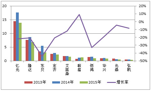 數(shù)據(jù)來源:公司公報(bào)GGII整理 三季度10家LED封裝廠總營收同比減少23% 據(jù)GGII統(tǒng)計(jì)數(shù)據(jù)顯示,2015年三季度,臺(tái)灣10家LED封裝廠總營收達(dá)31.65億,同比減少23%。具體來看,2015年三季度,臺(tái)灣10家LED封裝上市企業(yè)中,除聯(lián)嘉外,其余企業(yè)營收均有所下滑,其中,東貝營收下滑幅度最大達(dá)44.1%。 圖32013-2015年三季度臺(tái)灣10家LED封裝廠營收情況(單位:億元人民幣,%)
