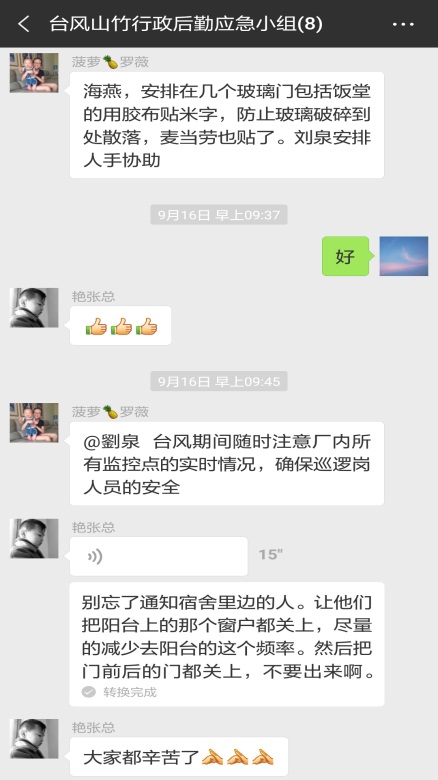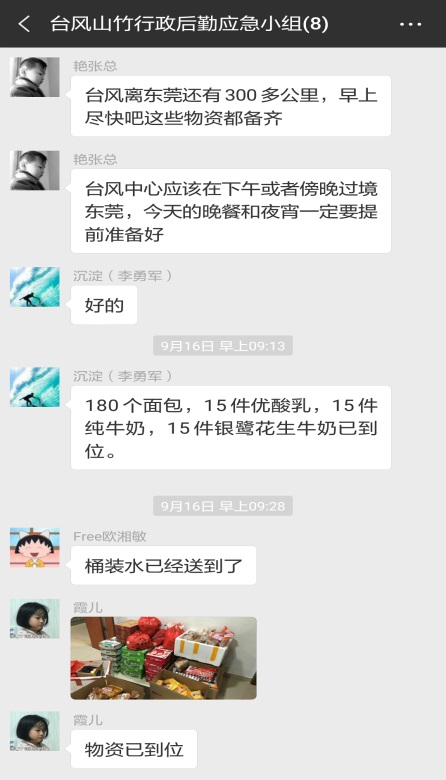 眾志成城,共抗“山竹”;風里雨里,感謝有你來源:中圖科技 發(fā)布時間:2018-09-17 點擊:5448 次初秋的九月,臺風頻繁造訪的季節(jié)。今年第22號臺風“山竹”來勢洶洶,于9月16日17時在廣東臺山登陸,期間東莞市市風力最高達11-12級,東莞市氣象部門發(fā)布臺風紅色預警,全市“四停”,進入臺風防御緊急狀態(tài)。為確保員工生命財產安全,我們公司進入全面警戒防御狀態(tài)。 一、嚴陣以待,提前預警,落實責任 9月15日晚,公司啟動應對自然災害突發(fā)事件應急預案,成立應急小組,針對臺風最新動向,全面部署工作,明確各部門、應急小組、現(xiàn)場應急指揮等人員和職責。應急小組成員開展隱患排查、清點應急物資、安排食堂供餐以及制定停水停電應急處理措施等,應對隨時可能出現(xiàn)的突發(fā)情況,力爭臺風到來前防御工作全覆蓋、無疏漏。