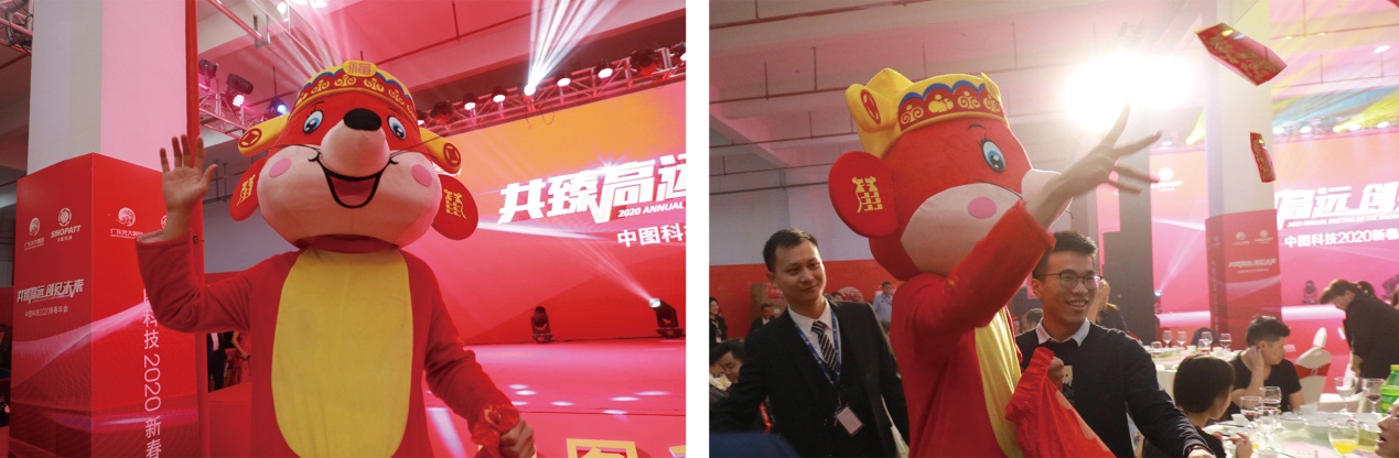 迎新納福 晚會(huì)在熱烈的開(kāi)場(chǎng)視頻和奪人眼球的吉祥物撒紅包中拉開(kāi)了序幕。