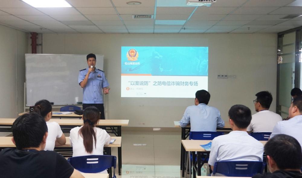 通用類培訓(xùn)—《防電信詐騙、網(wǎng)絡(luò)安全及風(fēng)險(xiǎn)防范專題講座》來源:中圖科技 發(fā)布時(shí)間:2019-07-16 點(diǎn)擊:4963 次為積極應(yīng)對(duì)當(dāng)前新型網(wǎng)絡(luò)電信詐騙案件高發(fā)的態(tài)勢(shì),將反詐宣傳延伸到企業(yè)當(dāng)中,進(jìn)一步增強(qiáng)員工風(fēng)險(xiǎn)意識(shí)和辨別電信網(wǎng)絡(luò)詐騙的能力。2019年7月12日,邀請(qǐng)到了松山湖派出所到司開展《防電信詐騙、網(wǎng)絡(luò)安全及風(fēng)險(xiǎn)防范專題講座》,此次講座由王警官和何警官主講,共有46人參加。